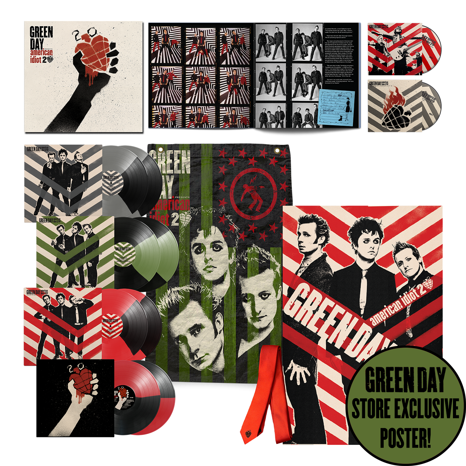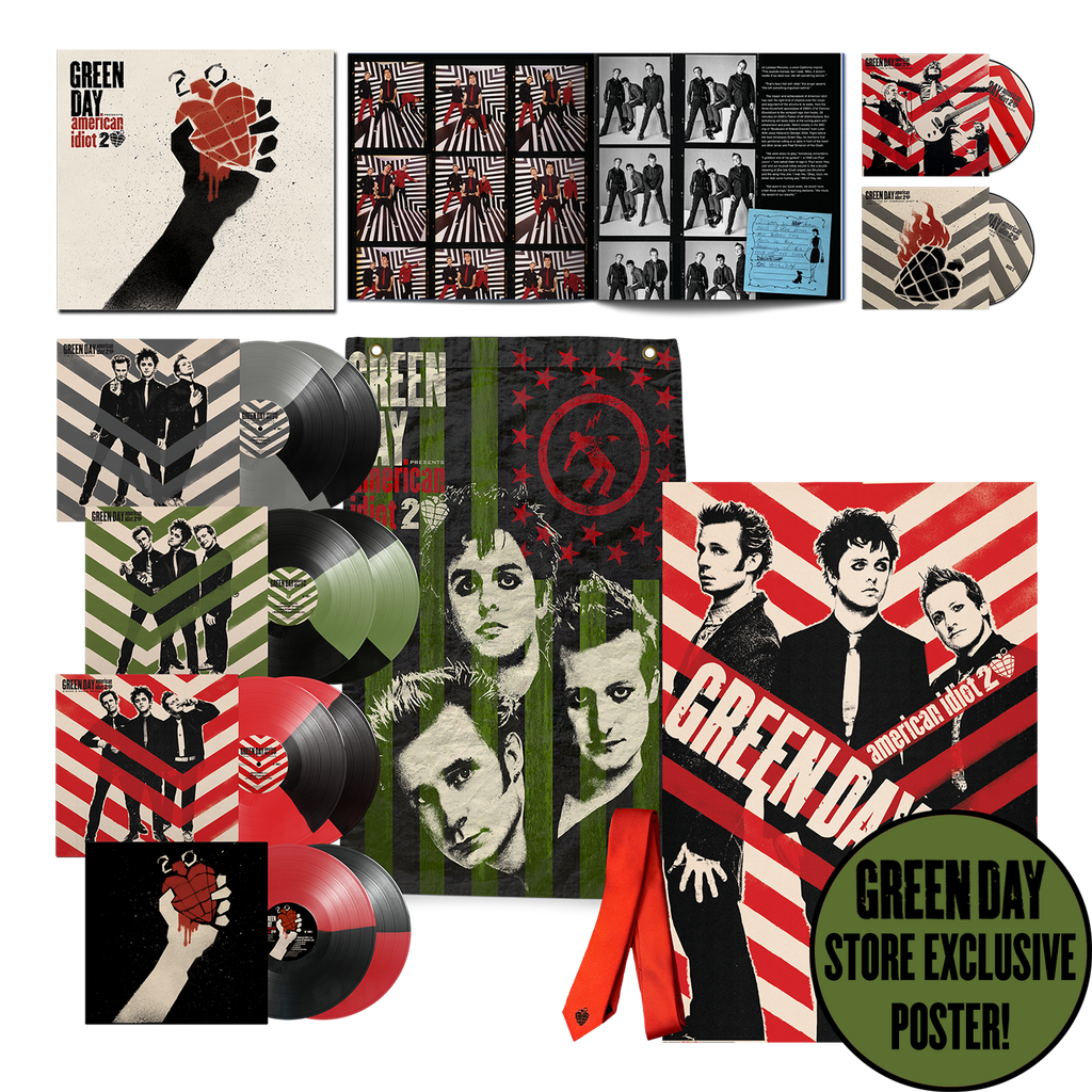 The deluxe vinyl box features the eight LPs pressed on different color vinyl, plus a 36-page book, a large Green Day flag, and the iconic American Idiot red tie. The Green Day Store version also features an exclusive poster.