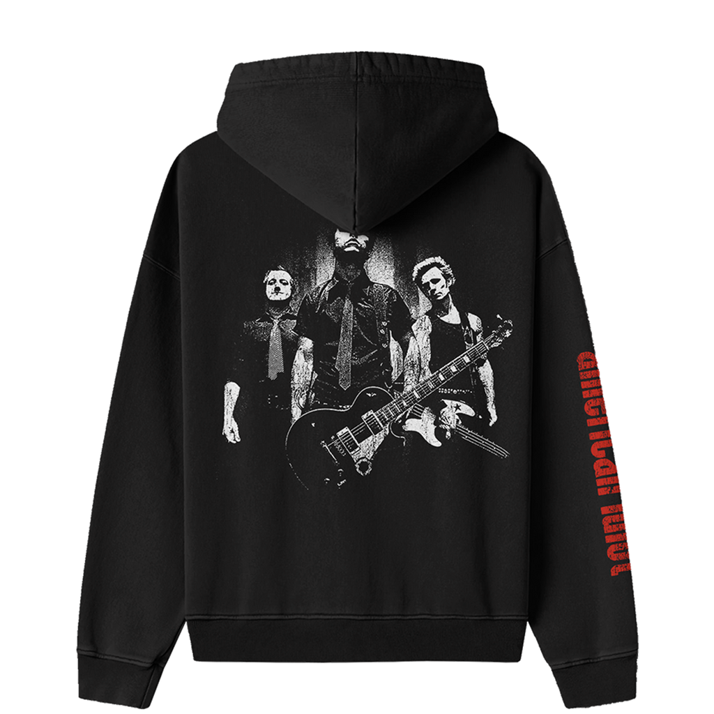 American Idiot-era photo printed on a unisex black zip up hoodie. 80% Cotton, 10% Polyester, 10% Recycled Polyester.