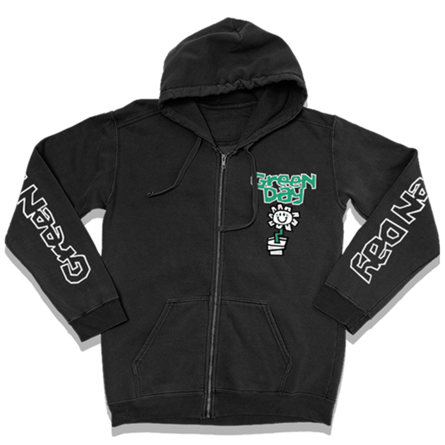 Screenprinted on an 8.5oz cotteon/polyester blend black zip up hoodie.