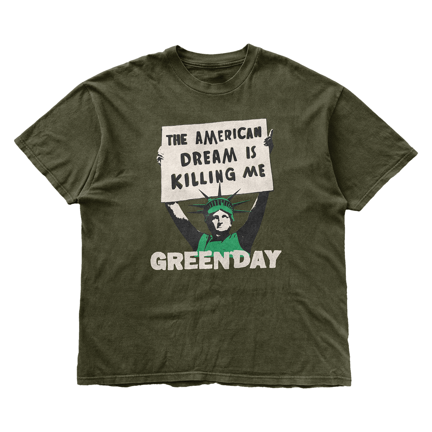 Printed on a 6oz 100% cotton classsic fit moss green t-shirt.