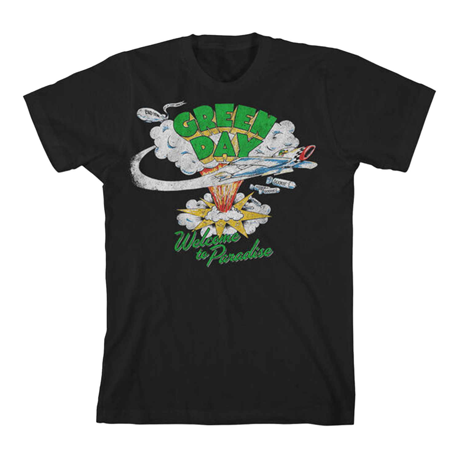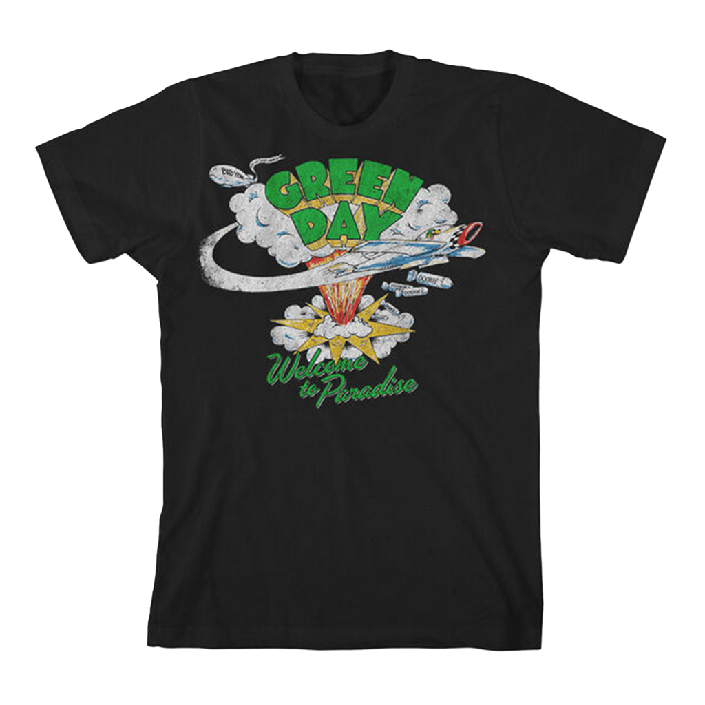 Black 100% cotton t-shirt with Welcome To Paradise graphic printed on the front.